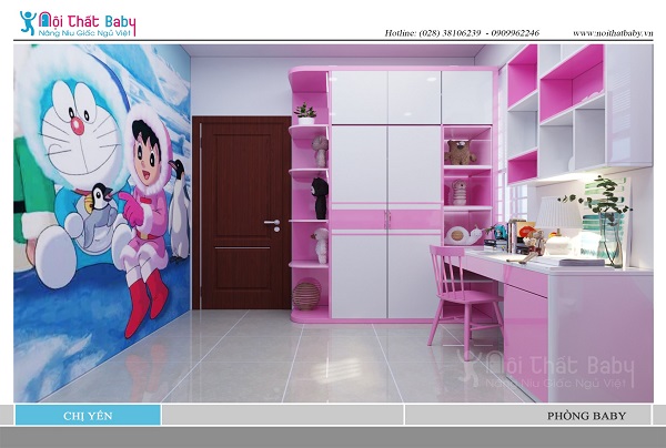 Phòng ngủ có diện tích tương đối nhưng nội thất được sắp xếp theo trình tự hợp lí từ giường ngủ trẻ em, tủ áo trẻ em, bàn học trẻ em. Để đáp ứng đầy đủ nhu cầu sử dụng của bé. Ngoài ra, Nội thất Baby cũng rất chú trọng đến vấn đề thẩm mỹ và sự phối hợp màu sắc trong phòng ngủ bé gái sao cho hài hòa tránh sự nhàm chán khi chỉ chọn một tông màu.