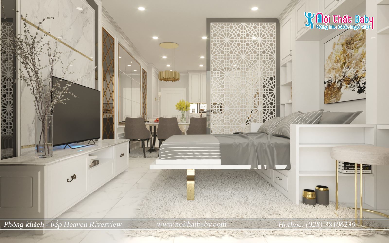 Về vị trí, căn hộ Heaven Riverview tại quận 8 bạn sẽ được sống trong một khu căn hộ theo tiêu chuẩn Singapore với ngập tràng không gian xanh mát. Và nội thất cũng vậy, Nội Thất Baby chọn cách bố trí tối giản, tiết kiệm được không gian nhưng vẫn đảm bảo yếu tố công năng.