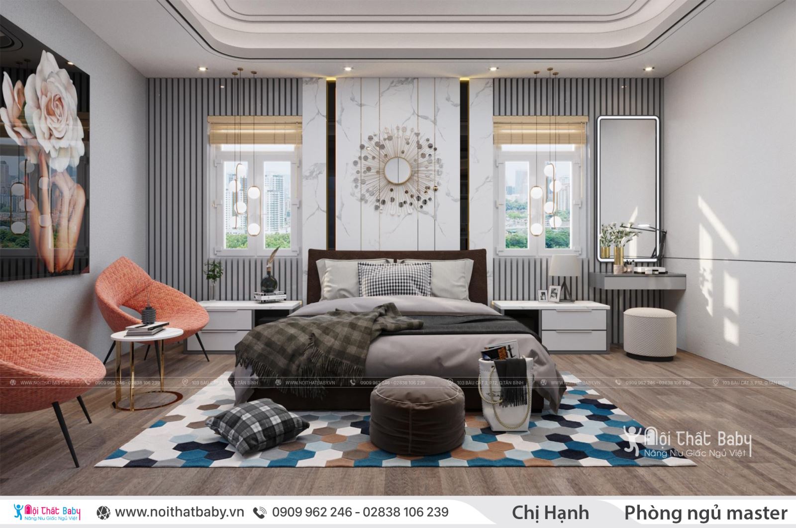 Từng mét vuông trong phòng ngủ đều được thiết kế tỉ mỉ, tinh xảo, thoáng mát nhu·ng vẫn mang xu hướng hiện đại, sang trọng, thanh lịch. Hãy để Nội thất baby thực hiện ý tưởng của bạn.