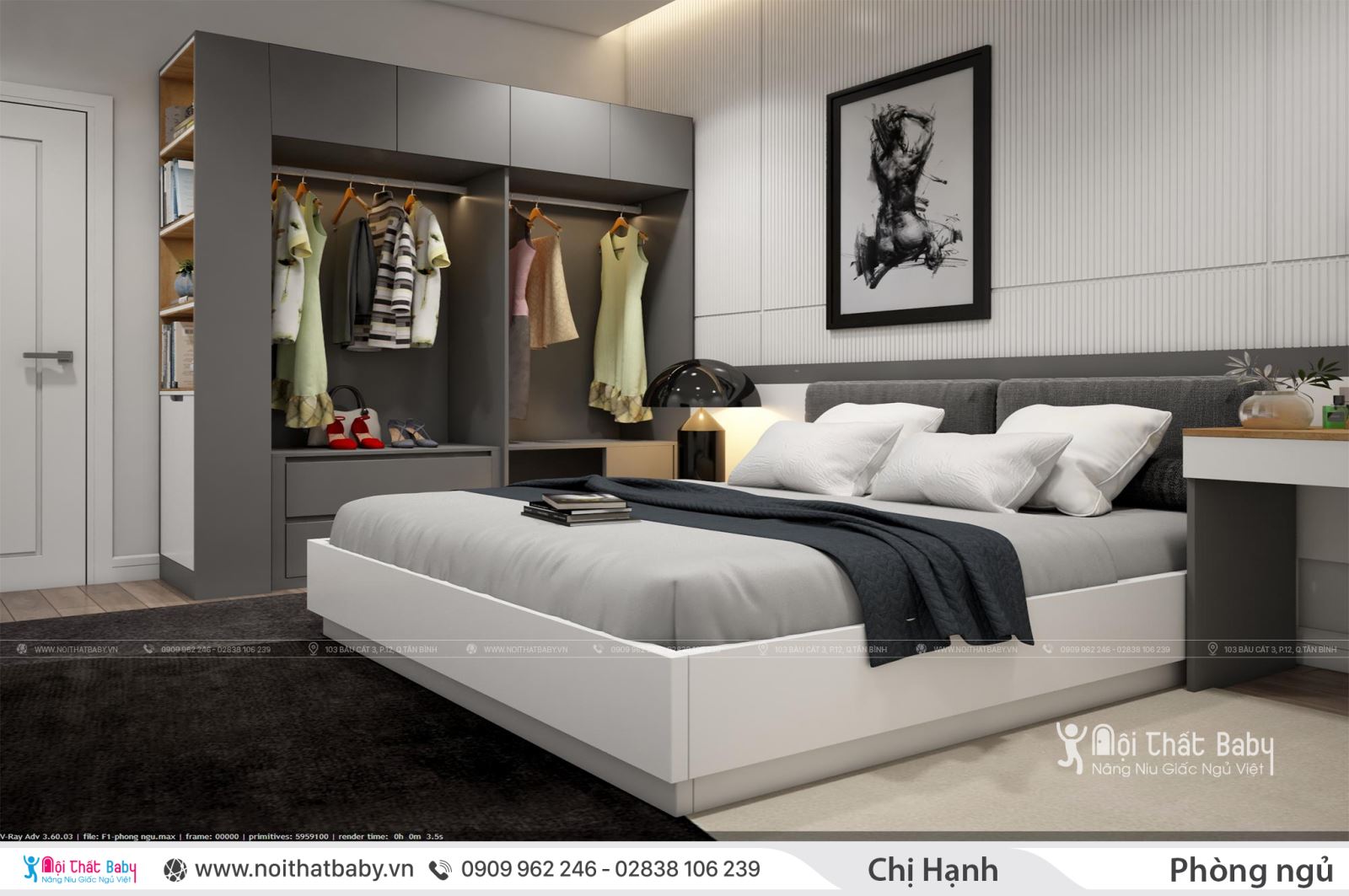Không gian phòng ngủ Master được kết nối sáng tạo các gam màu trắng và xám sang trọng tạo nên một không gian nội thất phòng ngủ đầy sự quyến rũ và thanh lịch hơn. Không gian phòng ngủ nhà chị Hạnh Quận 9 được các KTS Nội thất baby thiết kế với tất cả tâm huyết, thổi hồn trong từng đường nét nội thất và phù hợp từng công năng sử dụng. Thiết kế nội thất phòng ngủ được bố trí tinh tế và tỉ mỉ tạo một không gian phòng ngủ thông thoáng và rộng lớn như: giường ngủ, kệ tivi, bàn trang điểm...