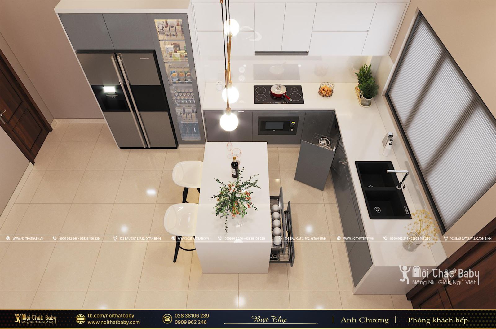 Với thiết kế thông minh cùng những đường nét gọn gàng và được tích hợp đầy đủ công năng thì mẫu tủ bếp chữ L kết hợp bàn đảo này được xem là giải pháp hoàn hảo nhất cho các không gian, giúp gia chủ tiết kiệm thời gian hiệu quả hơn trong công việc nấu nướng. Tủ bếp không quá cầu kỳ với gam màu trắng - xám nhã nhặn, được tạo nên bởi những người thợ có tay nghề cao, có cái nhìn thẩm mỹ.