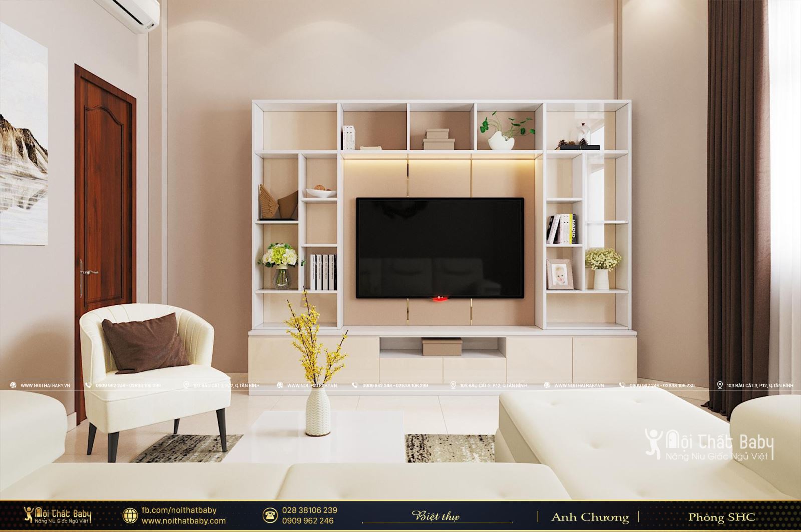 Thiết kế phòng khách hiện đại sẽ làm cho toàn bộ ngôi nhà mang những nét đẹp quyến rũ và sinh động nhất. Mỗi một diện tích trong phòng khách được các KTS Nội Thất Baby bố trí hợp lý với những vật dụng nội thất cao cấp, đây sẽ là nơi thư giãn và nghỉ ngơi lý tưởng cho các thành viên trong gia đình.