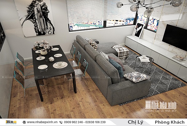 Thiết kế phòng khách liền kề với phòng ăn là một trong những giải pháp phù hợp để tiết kiệm diện tích đối với căn hộ chung City Gate có diện tích nhỏ. Bàn ăn được thiết kế gọn gàng, với gam màu nâu trầm mang tới không gian yên tĩnh cho cả căn hộ.