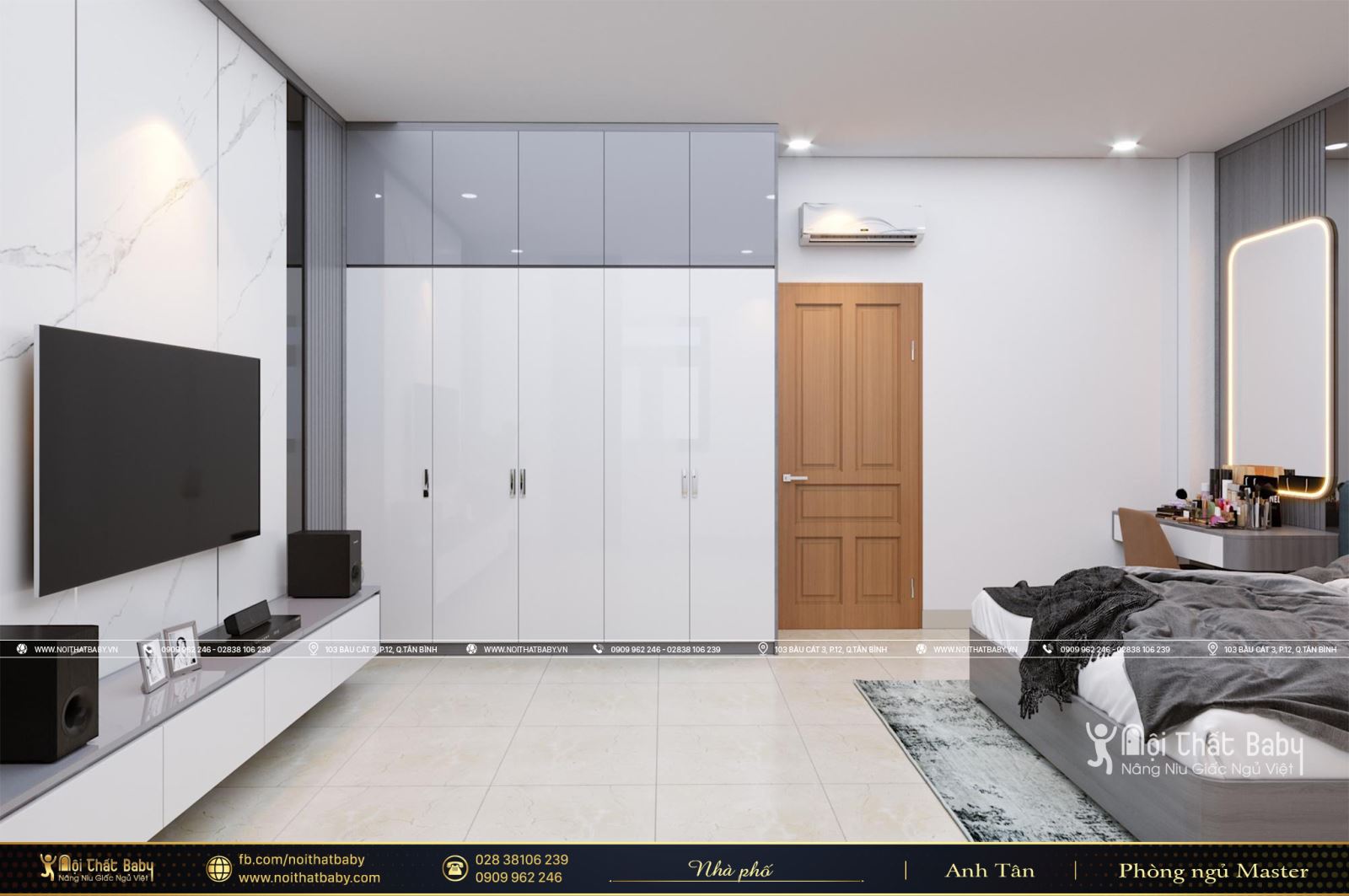 Thiết kế phòng ngủ Master nổi bật trên nền sơn trắng lịch lãm. Cùng với tone màu trắng chủ đạo, Nội Thất Baby đã mang đến cho mẫu phòng ngủ Master tại Quận Bình Chánh nét đẹp yên tĩnh đầy thư thái để có được những giây phút thư giãn thoải mái nhất. Thiết kế nội thất phòng ngủ Master sang trọng, đẳng cấp mang đến cho gia chủ một giấc ngủ ngon đúng nghĩa nhất.
